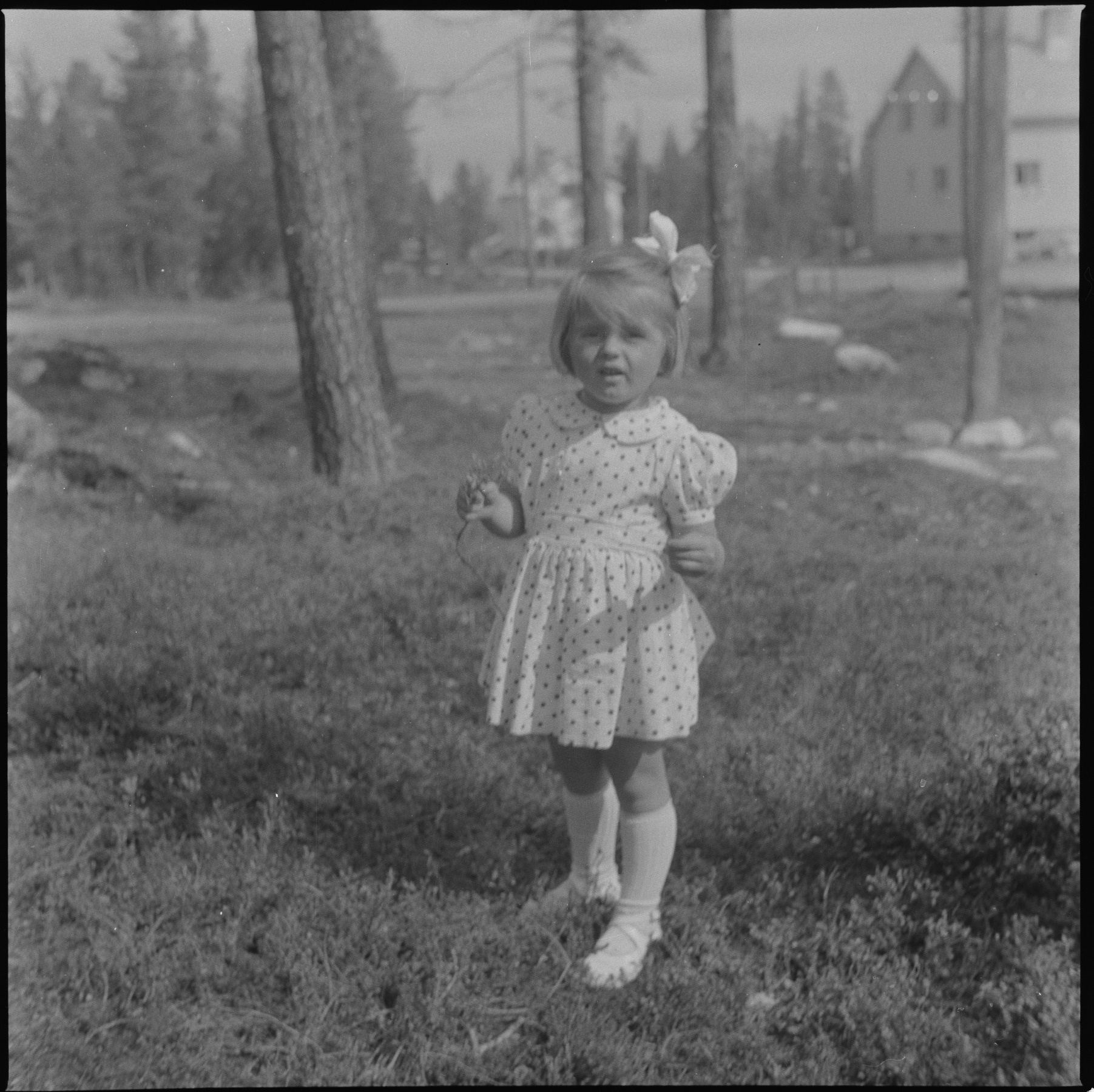 Ett barn med klänning står bland träd. Två hus är i bakgunden.