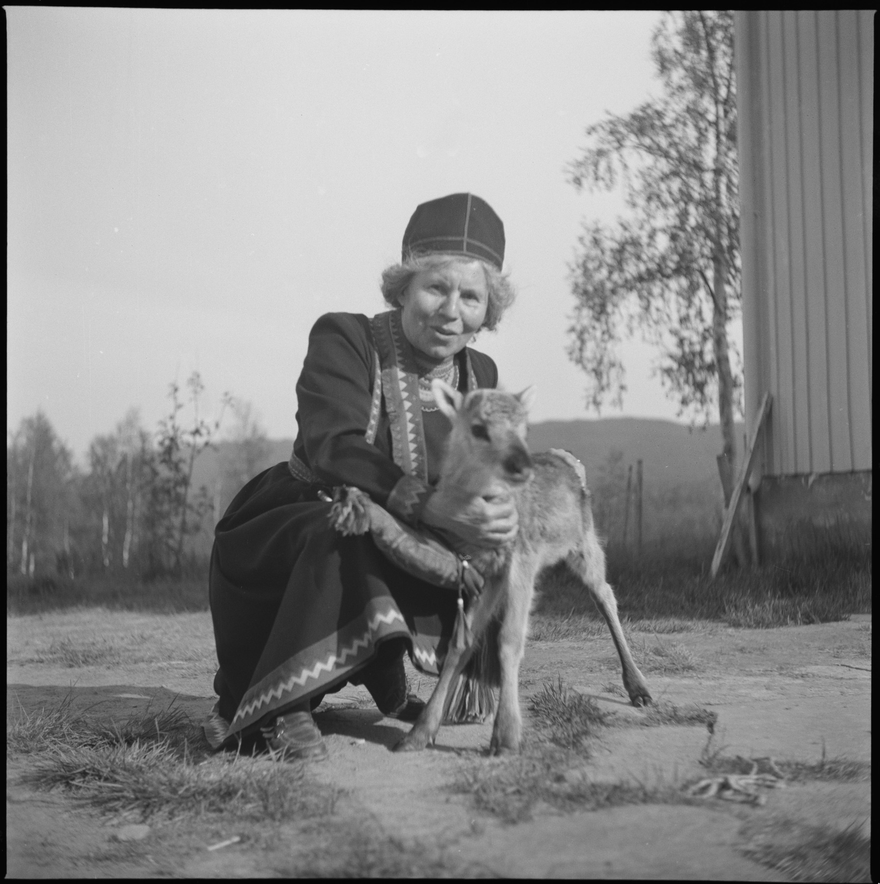 - Kvinnan på bilden är Karin Stenberg och hon bär gamla Arvidsjaurs-kolten. Hon håller i en liten renkalv. Kolten hon bär är en variant av gamla Arvidsjaurs-kolten, varianten hör till hennes släkt.